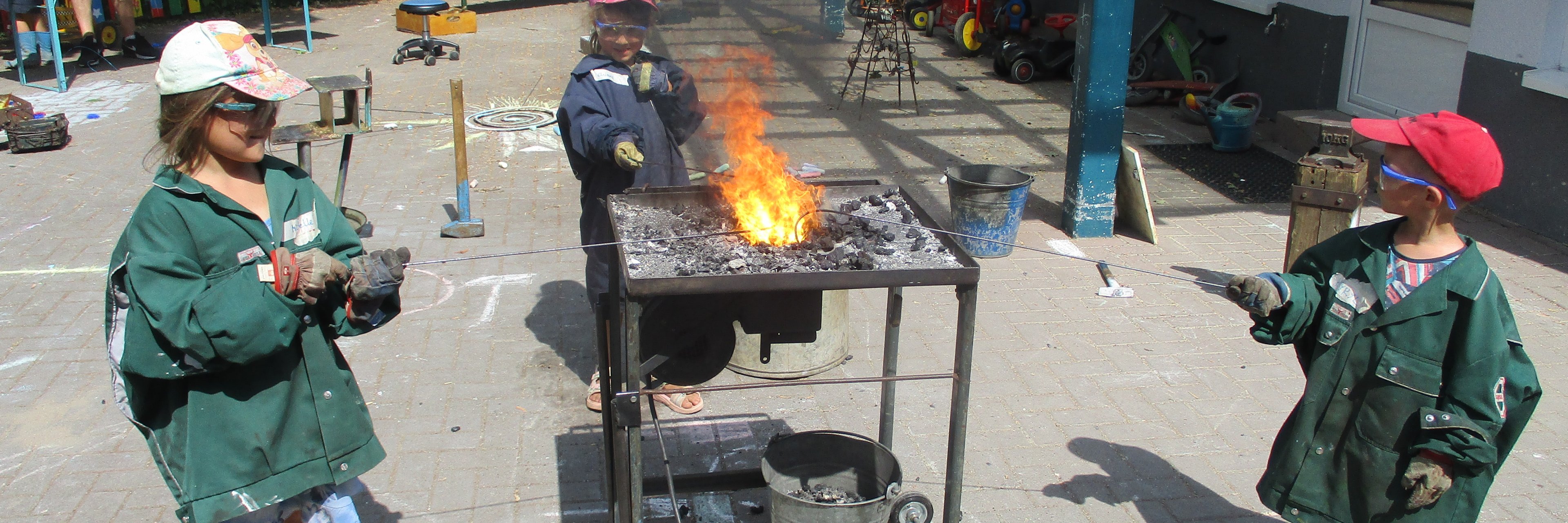 Die Esse wurde angezündet, Metallstäbe wurden bereitgelegt und die Schutzausrüstung wurde angezogen. Zuerst luden die Kinder ihren Zauberstab an der Kraftsonne mit Zauberkraft auf. An der Esse wurde der Zauberstab erhitzt und in seine ganz besondere Form gebogen. Hierfür musste kräftig der Hammer geschwungen werden. Zum Schluss kamen tolle Zauberstäbe mit Wellenformen oder Herzen zum Vorschein. Mit der magischen Zahl löschten die Lehrlinge die Zauberstäbe ab. Danach ging es mit dem Zauberstab in die Juwelenwerkstatt. Dort wurden die Zauberstäbe mit der Kraft der Juwelen versehen, sowie mit Federn und Draht verziert. Mit viel Ausdauer und Geschick hatten alle Lehrlinge bei Wind und Wetter die schönsten und mächtigsten Zauberstäbe geschmiedet.
