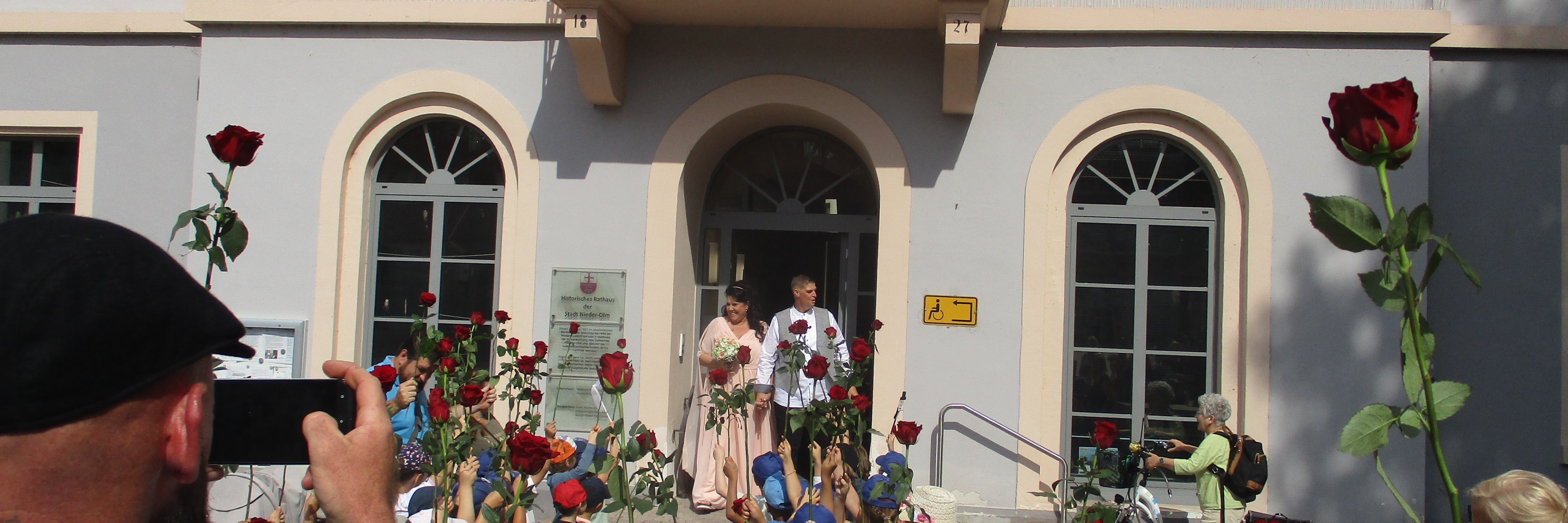 Das hieß es für unsere Hauswirtschaftskraft Pia im Juni. Dieses Ereignis wollten wir uns als Kita nicht nehmen lassen und haben kurzerhand alle Kinder geschnappt und uns auf einen kleinen Fußmarsch vorbereitet. Hand in Hand ging es für uns am frühen Morgen zum Marktplatz in Nieder-Olm, auf dem alle Kinder gespannt warteten. Als endlich die Braut mit ihrem Bräutigam auf dem Balkon zu sehen war, war die Freude groß! Pia und ihr Mann Andreas waren überwältigt. Doch das sollte noch nicht alles sein. Schnell stellten wir uns in einem Spalier vor dem alten Rathaus auf und bildeten ein Spalier mit Rosen. Anschließend gab es noch ein selbst gedichtetes Lied zur Melodie der "Vogelhochzeit".